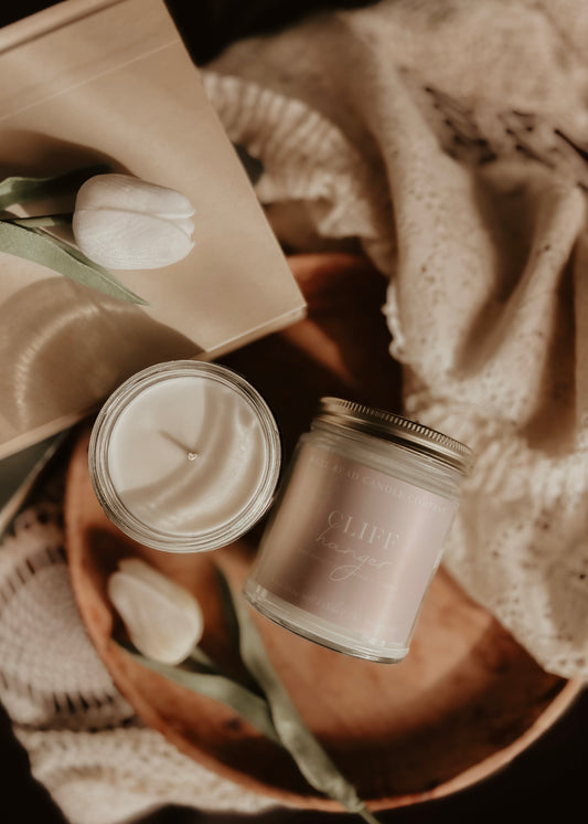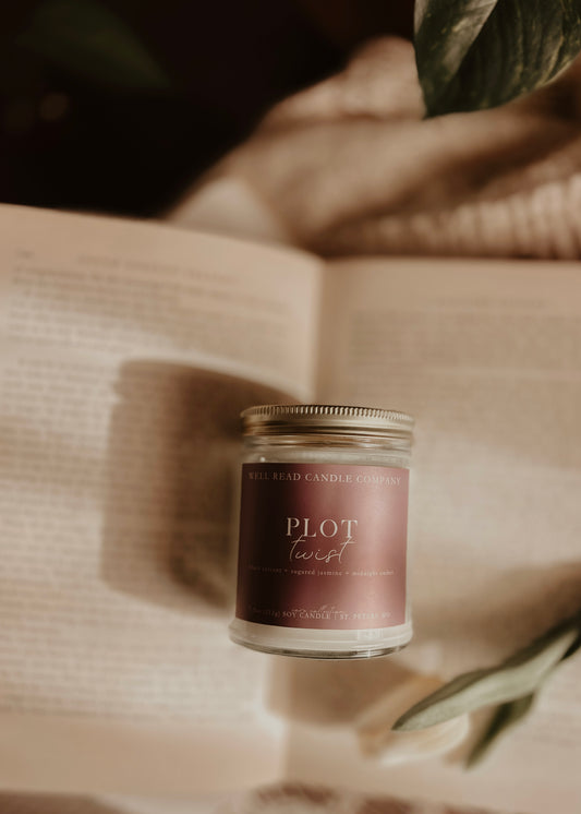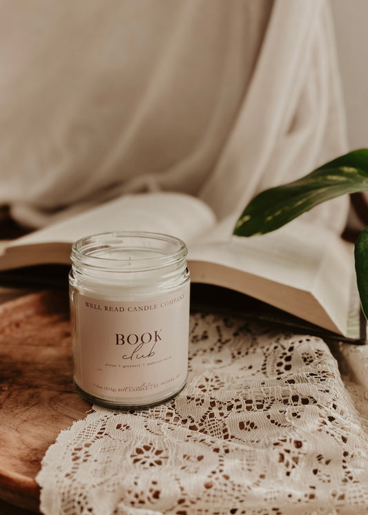 Well Read candles are made with all-natural Midwest-grown soy wax, flat braided cotton wicks, and clean, phthalate-free fragrance oils. Our core collection comes in a 7.5oz clear glass jar with a gold lid.